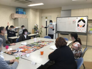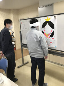 福笑いでは、ペアで指示を出す人、実際に目などのパーツを動かす人で分かれてもらい、試行錯誤しながらもなんとか形にしようと頑張っておられました。