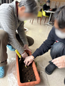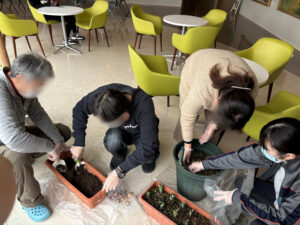 土や植物に触れることでのリラックス効果や、皆さんで育てたお花をたくさんの方に見ていただき季節を感じていただくことを目的に、チューリップの球根植えを行いました。