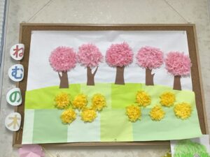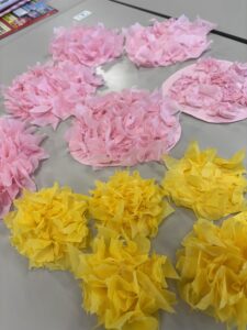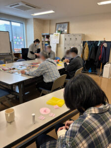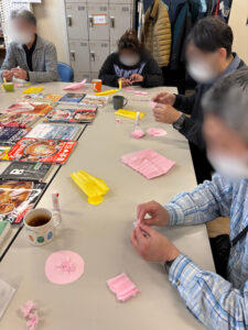 今回の季節の飾り作りは、桜並木と菜の花畑を作りました。桜や菜の花の台紙となる画用紙に、お花紙を小さくちぎり、真ん中を束ねて糊付けをし、台紙に隙間なく貼っていきます。皆さん最初は慣れず、難しい作業に取り組んでいましたが、次第に慣れていくとスピードも早くなり、ご自分のペースで取り組まれていました。完成品は圧巻で、花びら1枚1枚が立体的に見え、大変素敵な壁紙に仕上がりました。興味のある方は、ぜひ壁紙を見にデイケア室に見学にいらしてくださいね。