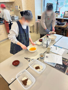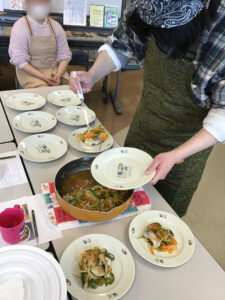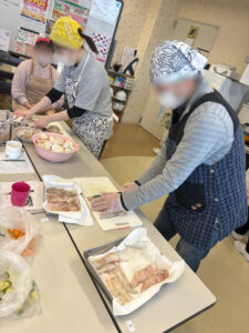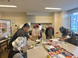 デイケアでは毎月、調理・かんたん調理・スイーツ作り・かんたんスイーツ作りのプログラムを行なっています。調理プログラムは、生活リズムの獲得や役割を担う経験をすることを目的に実施し、皆さんと協力しながら美味しい食事を作っています。